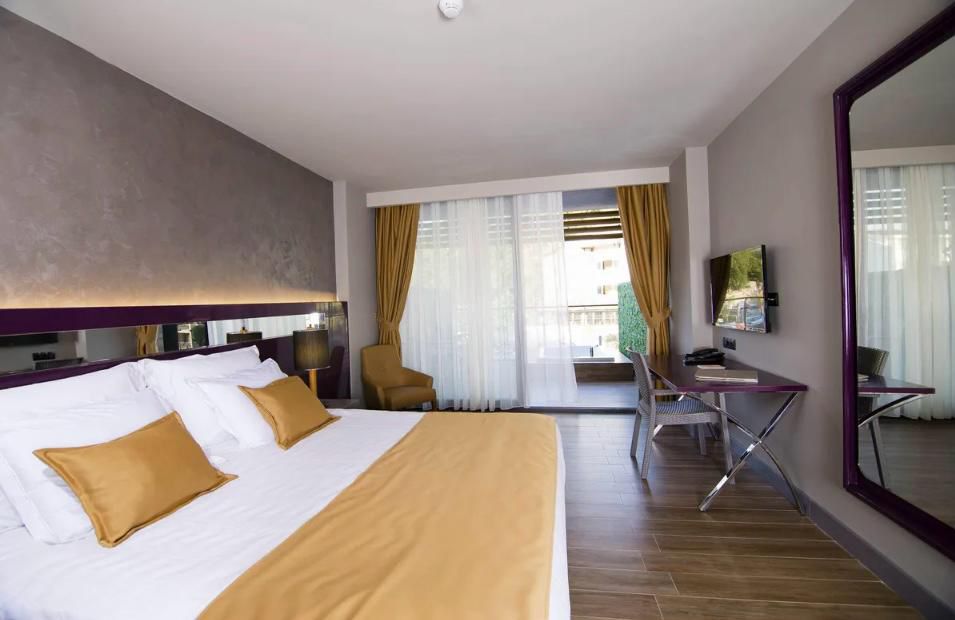 This hotel is located in the centre of İçmeler, the most beautiful town of Marmaris. It is 9 kilometres from Marmaris city centre and only 80 metres from the sea. Dalaman Airport is 90 kilometres away. The hotel has a total of 374 rooms and a bed capacity of 1,000. Within the hotel, you will find one main restaurant called Cave Wine and Dine, wireless internet, and four bars including Palm Bar, White Bar, Sunset Bar and Small Bites serving snacks. There are three pools for adults and three separate pools for children. The property also includes a car park, fitness centre, sauna, Turkish bath, mini club, children’s playground, lobby area, TV corner, table tennis, an amphitheatre, hairdresser and barber services, tattoo shop, beauty salon, jewellery shop and a photography service.